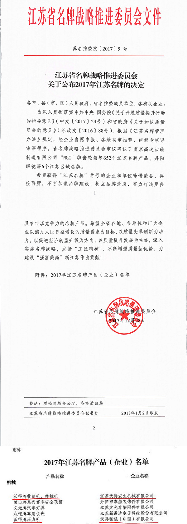 2018年1月2日,江蘇省名牌戰(zhàn)略推進(jìn)委員會(huì)公布了江蘇省“江蘇名牌”企業(yè)名單, 我集團(tuán)下屬子公司江蘇沃得農(nóng)業(yè)機(jī)械有限公司生產(chǎn)的沃得牌收割機(jī)、拖拉機(jī),沃得精機(jī)(中國(guó))有限公司生產(chǎn)的沃得牌壓力機(jī)榮獲“江蘇名牌”產(chǎn)品稱(chēng)號(hào)。